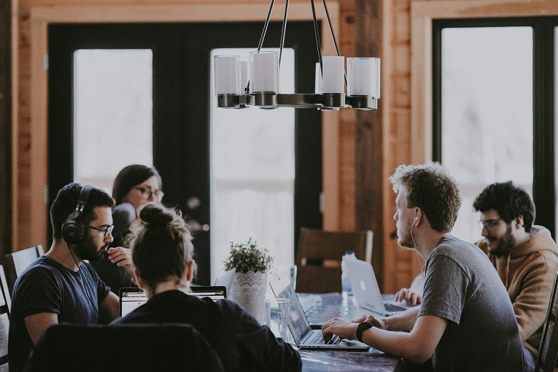 A group of four people are working on laptops at a table in a cabin. There is a chandelier with six bulbs above the table. The people are facing away from the camera, but the one in the foreground is looking at his laptop. A water bottle, a plant, and a glass of water are on the table. The windows behind the people show a view of nature.